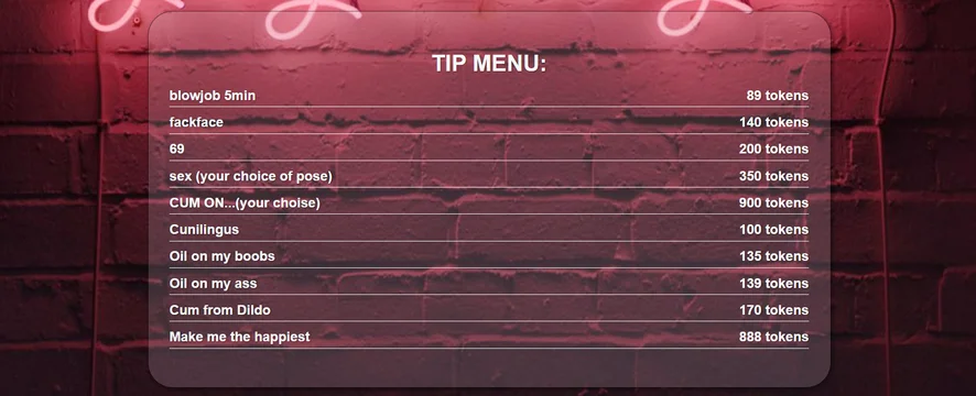 Blowjob, Cowgirl, Cumshot, Doggy Style, Handjob, Kissing, Massage, Masturbation, Orgasm, Pussy Licking, Topless, 69 Position, Sex Toys, Ahegao, Camel Toe, Dildo or Vibrator, Erotic Dance, Facesitting, Foot Fetish, Heels, Jerk-off Instruction, Rimming, Deepthroat, Spanking, Dirty Talk, Fingering, Gagging, Smoking, Striptease, Tittyfuck, Twerk, Hardcore, Oil Show, Facial, Fisting, Creampie